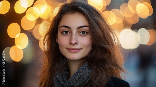 woman, girl, female, portrait, face, smile, happy, pretty, beautiful, young, adult, model, people, person, skin, hair, brown, eye, evening, night, light, bokeh, city, urban, dark, light, background, expression, emotion, cheerful, attractive, stylish, fashion, closeup, closeup, photo, image, picture, photo, portraiture