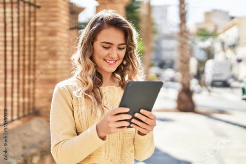 Young woman smiling confident using touchpad at street