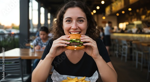 woman, young, smiling, happy, curly, hair, holding, burger, fresh, ingredient, casual attire, eatery, dining, food, lifestyle, cheerful, warm, lighting, relaxed, enjoying, casual clothes, friendly, atmosphere, people, background, dining table, fries, smiling face, epicure, informal, lunch, dinner