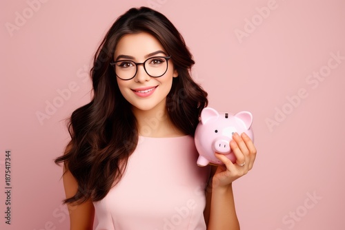 woman, baby pig, bank, saving, finance, money, investing, investment, financial, future, economy, budget, wealth, planning, banking, personal, secure, security, management, growth, profit, income, currency, fund, capital, cash, deposit, businesswoman, entrepreneur, student, adult, happy, cheerful, smiling, goggles, eyewear, long, hair, dark, brunette, pink, background, studio, shot, portrait, copy, space, isolated, success