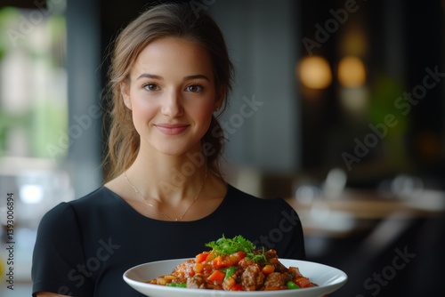 Young woman smiling, holding plate of Boeuf Bourguignon in dimly lit restaurant. Concept of enjoying French beef stew, capturing happiness and relaxation with Boeuf Bourguignon.