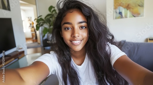 woman, girl, selfie, young, smiling, happy, home, house, indoor, apartment, living, room, couch, sofa, hair, long, black, brown, skin, tan, pretty, beautiful, face, eye, teeth, white, shirt, t-shirt, casual attire, clothing, apparel, portrait, photo, picture, image, expression, joyful, cheerful, relaxed, comfortable, confident, natural