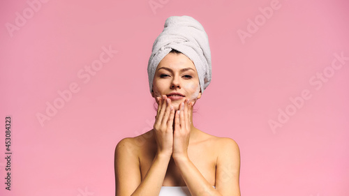 white, isolated, happy, smiling, beauty, cheerful, caucasian, well-being, face, care, brunette, towel, skin, pink, emotion, woman, apply, skincare, body, purity, treatment, joyful, facial, mask, positive, pleased, wellness, peeling, bodycare, scrub, pampering, terry, exfoliating, copy space, one person, studio shot, young adult