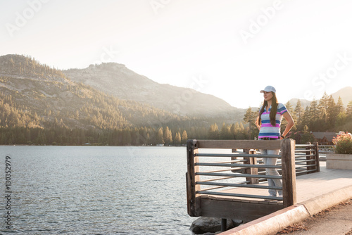 Young woman standing on a wooden lake pier