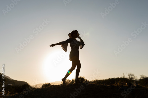 young, woman, standing, hill, countryside, clear, sky, fun, copy space, 1, people, travel, adult, journey, female, outdoors, sunset, atmosphere, raising, arm, sun, hat, casual attire, leisure, recreation, escapism, spain, rural, sunlight, nature, carefree, summer, season, silhouette, landscape, caucasian, vacation, lifestyle, enjoyment, calmness, weekend, solitude
