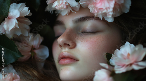 Young woman surrounded by blooming flowers in a serene moment of tranquility