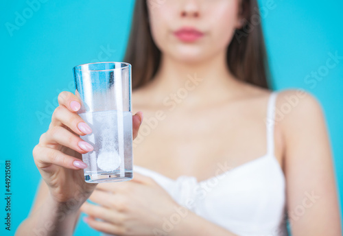 Young woman taking pill against headache. Brunette taking a pill with a glass of water. Woman taking drugs to releave headache. Brunette take some pills, holds glass of water, isolated on blue