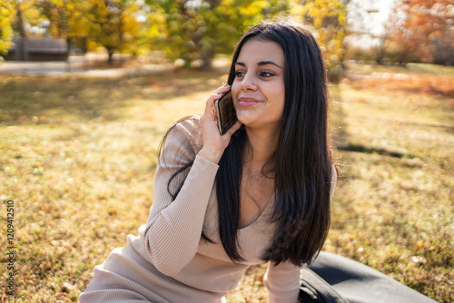 woman, park, autumn, phone, smartphone, call, talking, relaxing, nature, fall, leaf, tree, outdoors, communication, mobile, technology, connection, serene, peaceful, calmness, happy, smiling, enjoyment, leisure, lifestyle, young, adult, female, brunette, casual attire, sweater, dress, sitting, grass, sunlight, golden hour, warm, vibrant, scenic, landscape, season, october, november, foliage, colours, beauty, day, copy space, horizontal