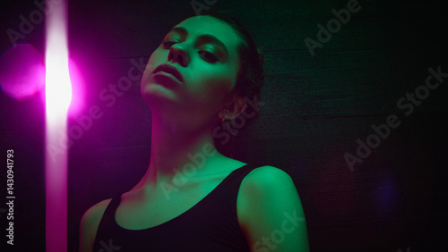 Young woman tilts head back under vivid pink light beam with intense gaze and green glow on face, highlight appearance in studio. Concept of beauty and fashion, self-expression, human emotions.