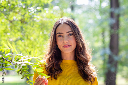 young, woman, touching, twig, park, smiling, copy space, 1, people, adult, outdoors, day, head shot, sunlight, leaf, plant, tree branch, knitted, casual attire, beautiful, brown hair, caucasian, green, colours, yellow, lifestyle, nature, growth, long hair, hair, italy, female