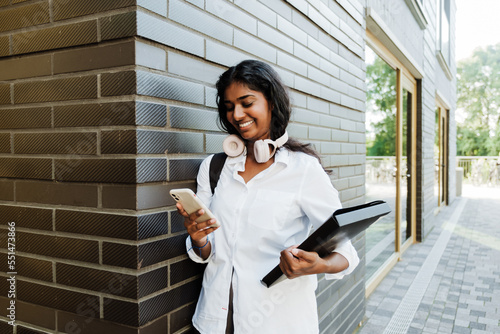woman, adult, young, indian, people, portfolio, phone, mobile, mobile phone, document, folder, earphones, earphones, student, study, smile, online, communication, town, street, urban, happiness, city, brunette, female, 1, outside, outdoors
