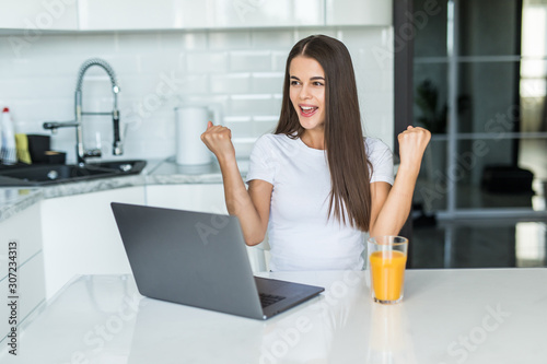 woman, business, computer, person, girl, house, hot drink, cyberspace, technology, kitchen, cheerful, excited, happy, home, laptop, winner, young, achievement, arm, celebrate, celebration, cheer, confident, emotion, excitement, expression, exuberant, female, fun, happiness, joy, positive, proud, screaming, smile, student, success, successful, table, triumph, triumphant, using, victory, succeed, amazed, both, browse, celebrate, curly, hair