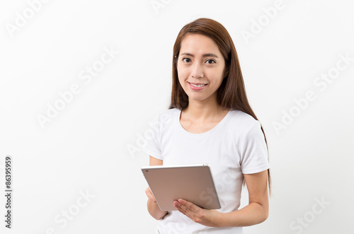 woman, lady, girl, female, japanese, korean, chinese, asia, asian, china, mandarin, taiwanese, casual attire, wear, clothes, tee, t-shirt, top, vest, tank, apparel, use, surfing, touch, type, hold, tablet, digital, technology, computer, wireless, modern, touchpad, equipment, social, media, isolated, white, background, people, person, portrait, 1