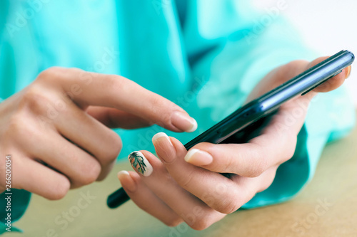 Young woman using smartphone for surfing and browsing Internet, searching for required information, sitting at desk with laptop.