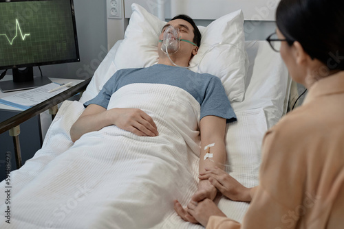 Young woman visiting her sick husband in hospital ward, she sitting and holding his hand while he lying on bed with oxygen mask