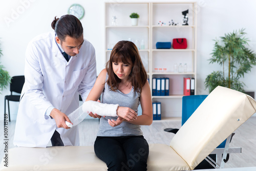 care, doctor, health, health care, hospital, injured, injury, man, woman, medicals, medicine, pain, patient, physician, practitioner, recovery, rehabilitation, healer, treatment, broken, clinic, fracture, sprain, filtered, elastic, tape, strap, band, bandage, bandaged, torn, arm, hand, discussing, explaining, rehab, orthopedics, osteopath, couch, insurance, accident, fixing, bandaging, wound, specialist, recovering, suffering, painful, elbow
