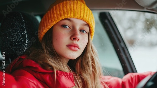 young, woman, beanie, yellow, jacket, red, car, winter, snow, outside, looking, camera, sitting, copy, space, cold, fashion, stylish, casual attire, portrait, beauty, happiness, lifestyle, inside, warmth, cosy, cheerful, scene, frost, personal, expression, natural, smile, cute, trendy, headwear, vehicle, adventure, travel, comfort, snowflake, scenery, observation, atmosphere, perspective, ambience