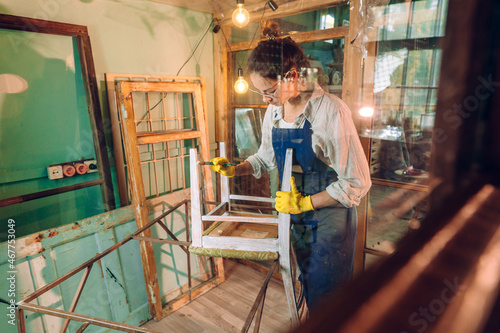 woman, men at work, workshop, lifestyle, manufacturing, small business, maker, furniture, workplace, redesign, working, technology, design, chair, reuse, restoring, renovating, recycling, home, paint, indoor, wooden, resource, ecological, garbage, job, tool, decoration, equipment, reduce, work, apron, person, protective, people, creativity, making, hand-made, female, decor, occupation, craft, ecology, industry, material, recycled, studio, concept