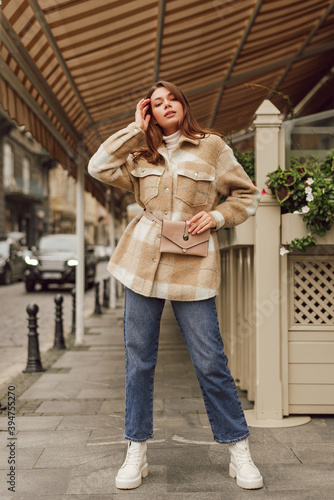 Young woman wearing stylish trendy plaid shirt. Casual outfit. Street style fashion