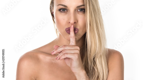 Young woman with a finger near her lips. Studio shot. Isolated on white background