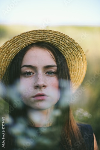 girl, flower, field, bright, 20s, young, woman, summer, spring, romantic, portrait, outside, mood, light, hat