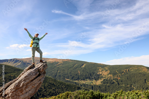 woman, female, young, girl, blue, beautiful, sky, background, nature, outdoors, adult, person, environment, landscape, journey, tour tourism, holiday maker, travel, trip, tour, adventure, freedom, wanderlust, wild, wilderness, caucasian, hike, hill, cliff, space, copy, text, happy, smiling, sleeping, mat, rolled, bag, equipment, gear, backpack, mountain, season, summer, lifestyle, autumn, explorer, peak, rocky