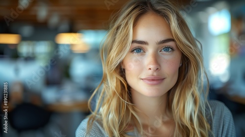Young Woman With Blonde Hair Posing for a Portrait in a Modern Office Setting