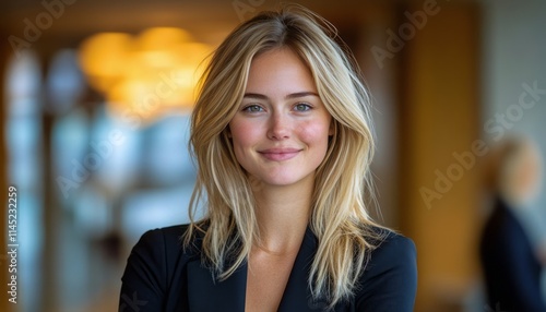 Young woman with blonde hair smiles confidently in a well-lit indoor environment