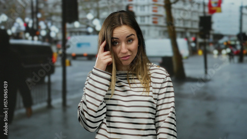 woman, blond, young, street, urban, city, emotion, striped, rainy, fashion, casual attire, background, standing, expression, people, crowd, building, traffic, daytime, light, motion, blurred, pedestrian, travel, weather, season, modern, european, scene, life, activity, neutral, female, portrait, view, style, culture, lifestyle, perspective, gaze, sharpened, outfit, attire, surrounding, journey, public, walking