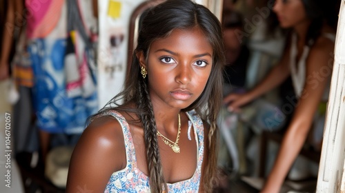 woman, girl, young, portrait, closeup, face, eye, looking, camera, brown hair, braid, braided, black hair, coiffure, natural, beauty, skin, earring, necklace, jewellery, fashion, clothing, dress, floral, pattern, summer, bright, happy, smile, indoor