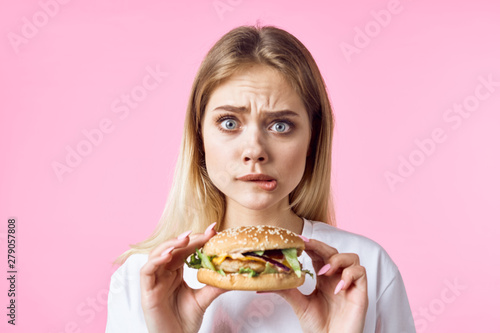 burger, food, woman, girl, hamburger, ravenous, hand, happy, isolated, fashion, studio, woman, eat, lady, background, diet, blue, fat, pink, junk, yellow, holding, fast, funny, people, 2, meal, model, person, sandwich, healthy, eatery, gluttony, 1, sexy, closeup, eating, teenage, knife, caucasian, luxury, cheeseburger, bite, chicken, portrait, girlfriend, delicious, concept, hair, summer