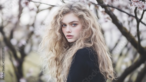 Young woman with curly blonde hair stands amidst blooming sakura trees, embodying serenity and natural beauty.