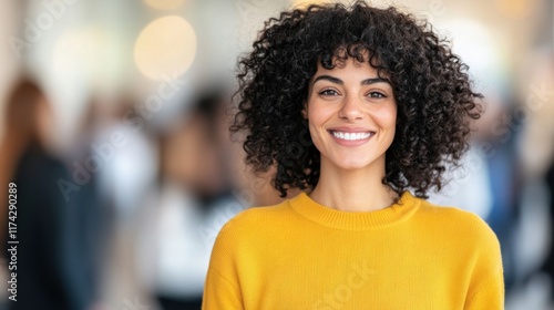 Young woman with curly hair beams with confidence in a lively office setting, surrounded by coworkers and dynamic work engagements