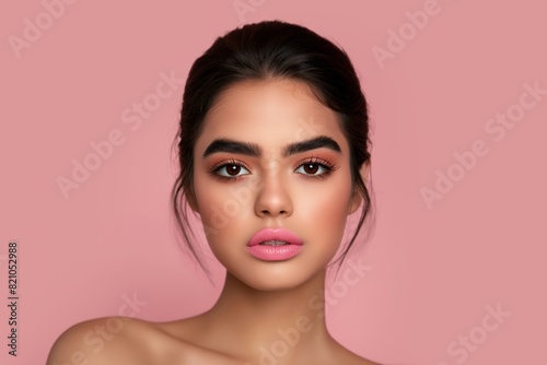 Young woman with dark hair, pink lips, and a poised expression, set against a soft pink background