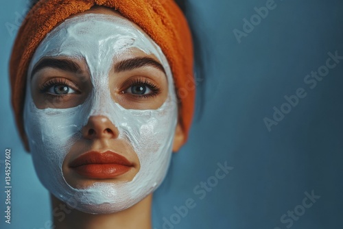 woman, female, young, face, mask, facial, beauty, skincare, skin, care, treatment, health, spa, routine, cosmetic, healthy, fresh, clean, portrait, head, shoulder, headband, orange, towel, blue, background, person, looking, eye, lip, red, make-up, model, lifestyle, wellness, studio, indoor, closeup, moisturise