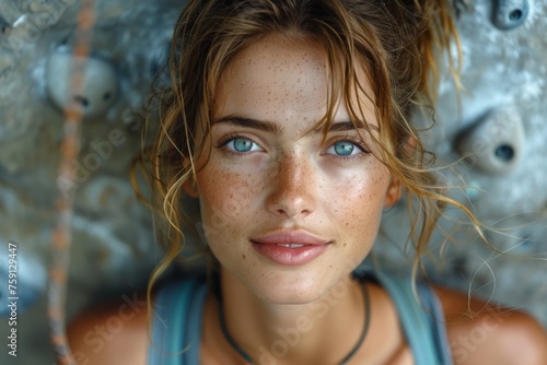 Young woman with freckles and blue eyes poses confidently against a textured climbing wall in a vibrant outdoor setting during daylight hours
