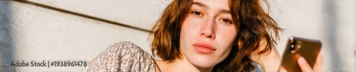 missy, young adult, attractive girl, casual clothes, wavy hair, natural beauty, outdoor lighting, shadow, whitewall, soft focus, communication, connectivity, networking, inspiration, creativity, daydreaming, independence, lifestyle, trendy, modern, technology, electronic device, mobile phone, person, people, closeup, copy space, fisheye, natural light, looking up