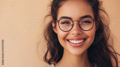 Young woman with glasses smiling and looking directly at the camera with a warm inviting expression.