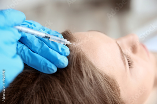 Young woman with hair loss problem receiving injection in clinic