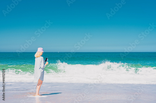 Young woman with hat standing near the sea and making selfie. Sea and sky background. Vacation and traveling concept. High quality photo