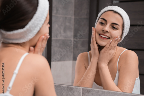 Young woman with headband washing her face near mirror in bathroom