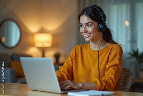 Young woman with headphones smiling typing on laptop at cozy home office for remote work study or online meeting with warm lamps background evening light atmosphere