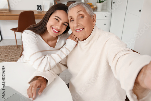 Young woman with her grandmother taking selfie at table in room