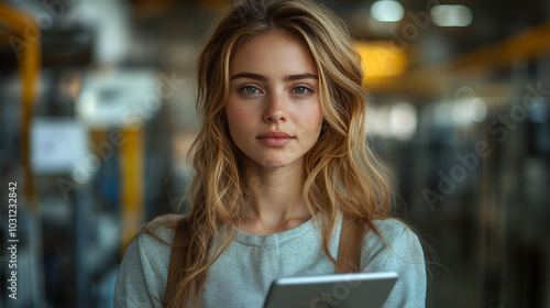 woman, blond, hair, young, female, adult, portrait, casual attire, sweater, grey, tablet, holding, looking, camera, serious, neutral, expression, face, soft, lighting, natural, warm, inviting, ambience, serene