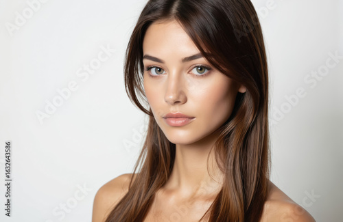 Young woman with long brown hair and striking green eyes. She wears a simple gray tank top, central composition, solo subject. No distractions, focus on the model.