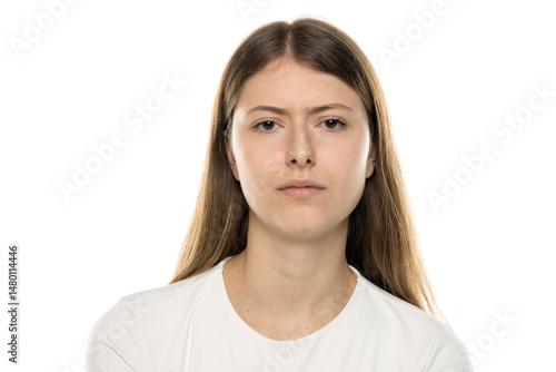 woman, frowning, displeased, serious, disapproval, annoyed, white, background, brown, hair, long, portrait, young, stern, t-shirt, unhappy, dissatisfied, studio, irritated, female, model, frustrated, discontented, scowling, natural, lighting, minimal, bothered, simple, clean, youth, adult, straight, contemporary, photo, profile, disgruntled, disappointed, concerned, sceptical, critical, head shot