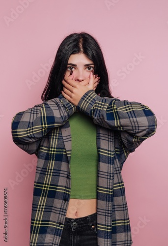 Young woman with long dark hair covering mouth with hands, wearing plaid shirt and green top, standing against pink background.