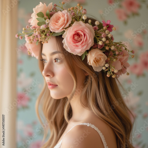 young woman with long, flowing hair adorned with floral crown featuring pink roses and delicate flowers, set against floral wallpaper background