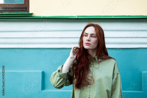 Young woman with long ginger hair outdoors in city. Young woman face with freckles
