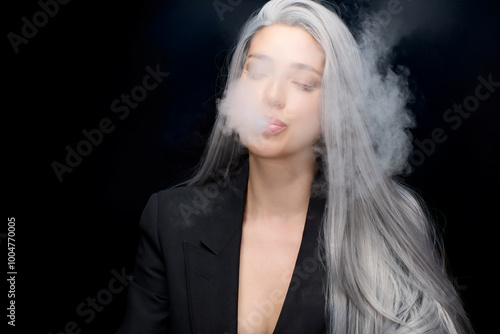 Young woman with long gray hair vaping and exhaling smoke against a dark background, capturing a modern and relaxed lifestyle concept.